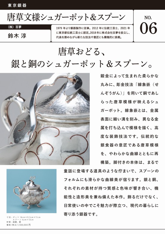 6 | 東京銀器 | (株)百夢 | 鈴木 淳 | 唐草文様シュガーポット&スプーン |
