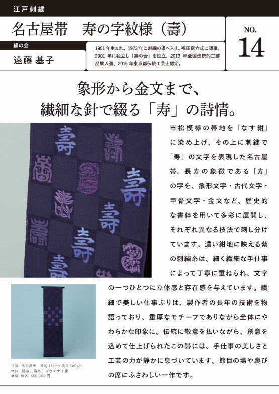 14 | 江戸刺繍 | 繍の会 | 遠藤 基子 | 名古屋帯 寿の字紋様(壽) |