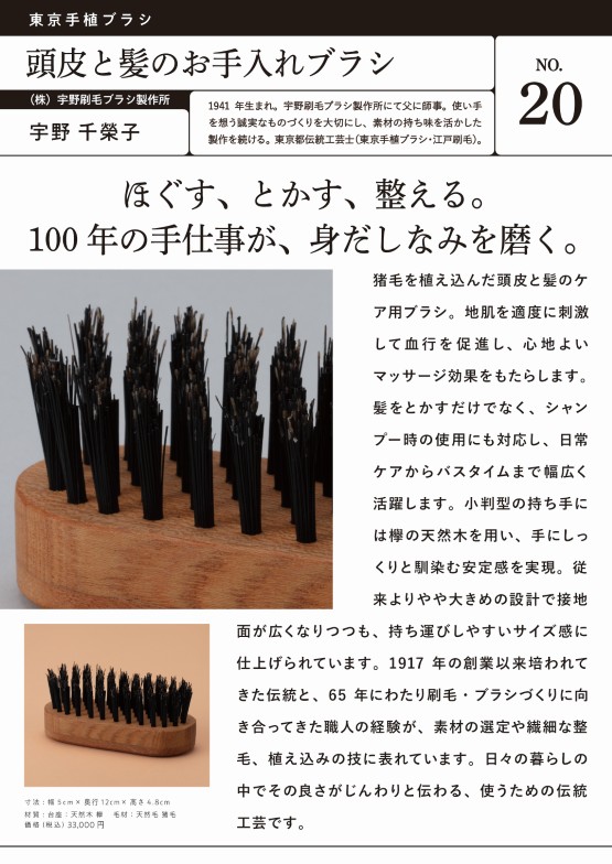20 | 東京手植ブラシ | (株)宇野刷毛ブラシ製作所 | 宇野 千榮子 | 頭皮と髪のお手入れブラシ |