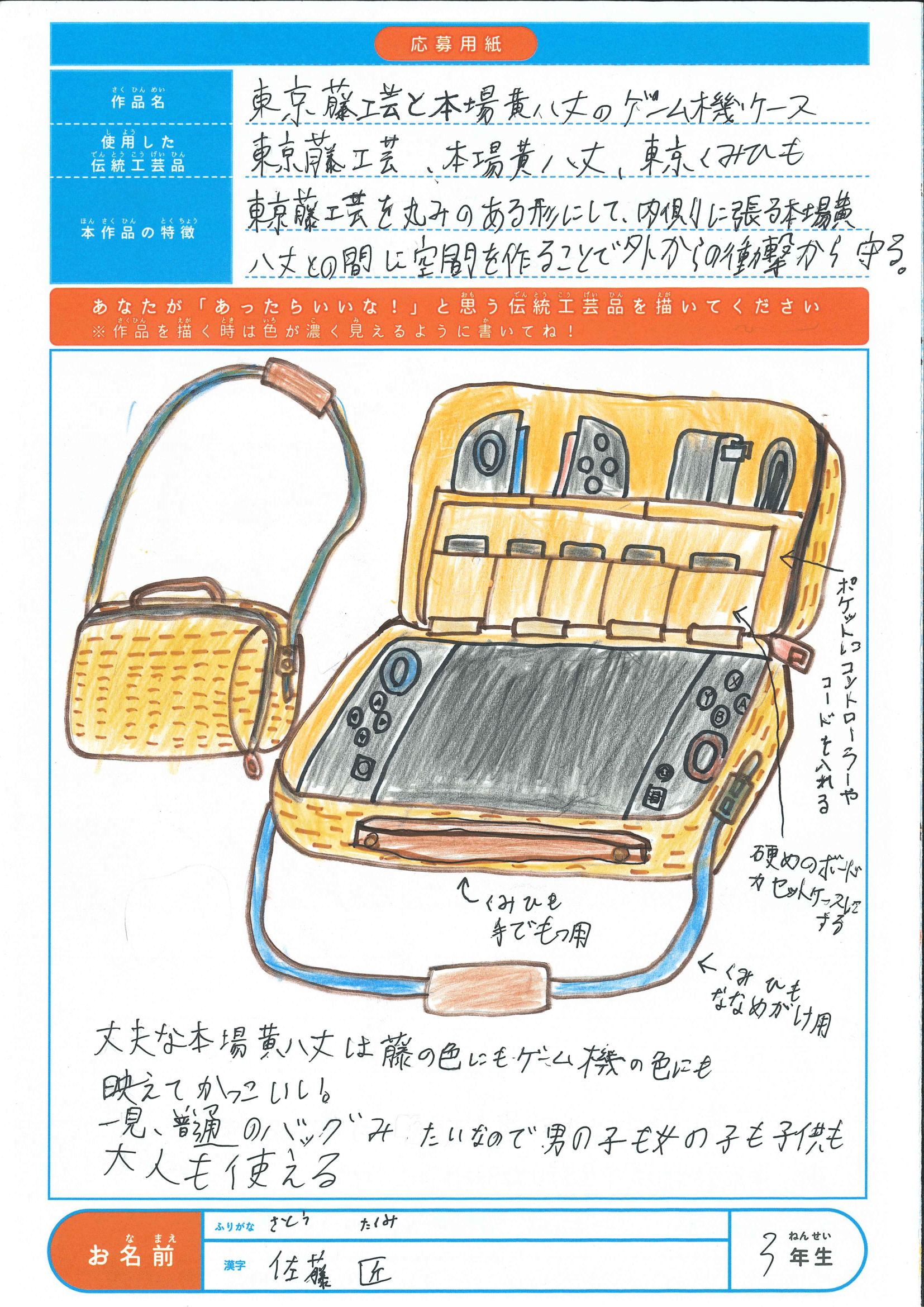 氏名 | 学年 | 作品名 | 佐藤匠さん | 3 | 東京籐工芸と本場黄八丈のゲーム機ケース |