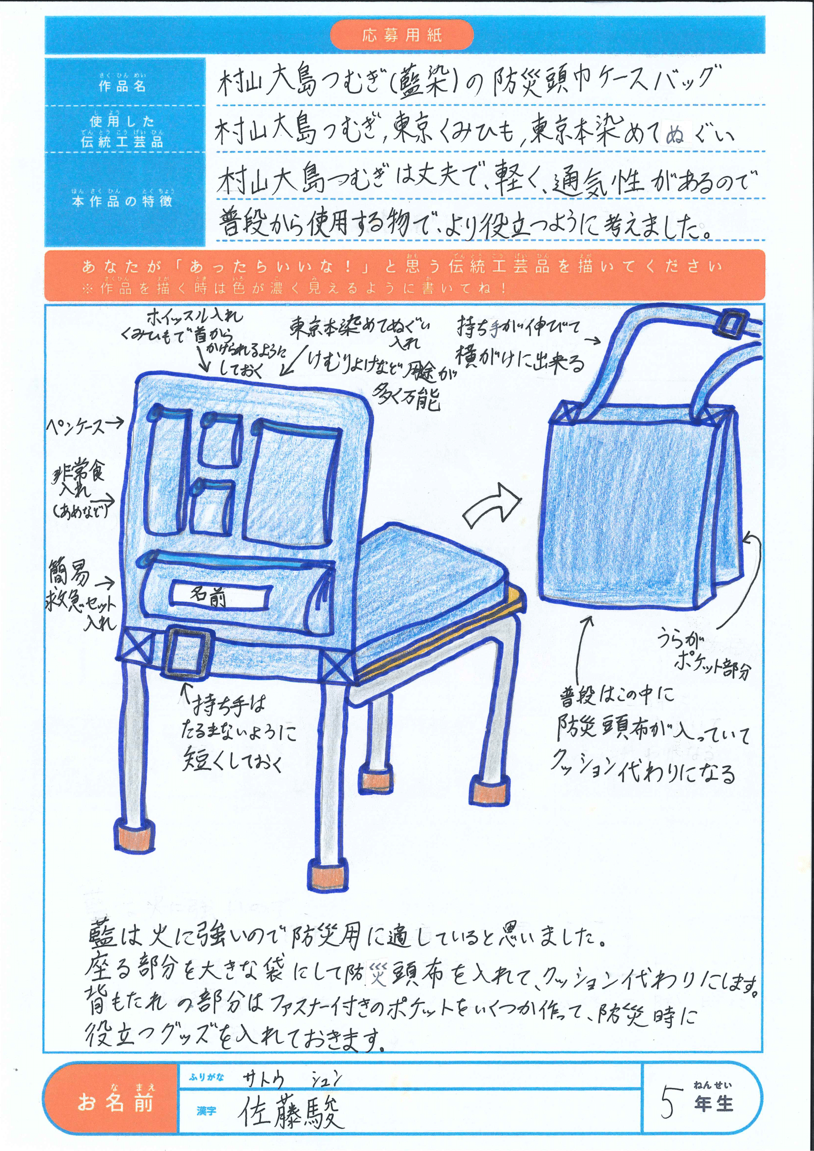 佐藤駿さん | 5 | 村山大島つむぎ(藍染)の防災頭巾ケースバッグ |